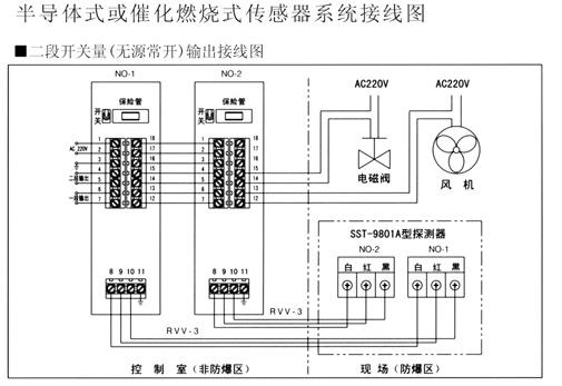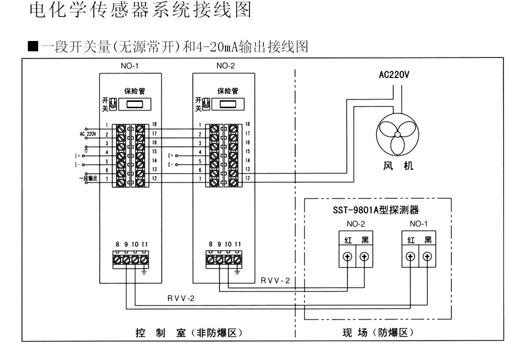 SST-9801A-W(2000型)气体报警装置为防爆型仪表,其组成为两个部分:探测器与报警控制器,探测器(一次表)安装在可能有气体泄漏的危险场所,其核心元件为气敏传感器;报警控制器(二次表)安装在安全场所的值班室内。